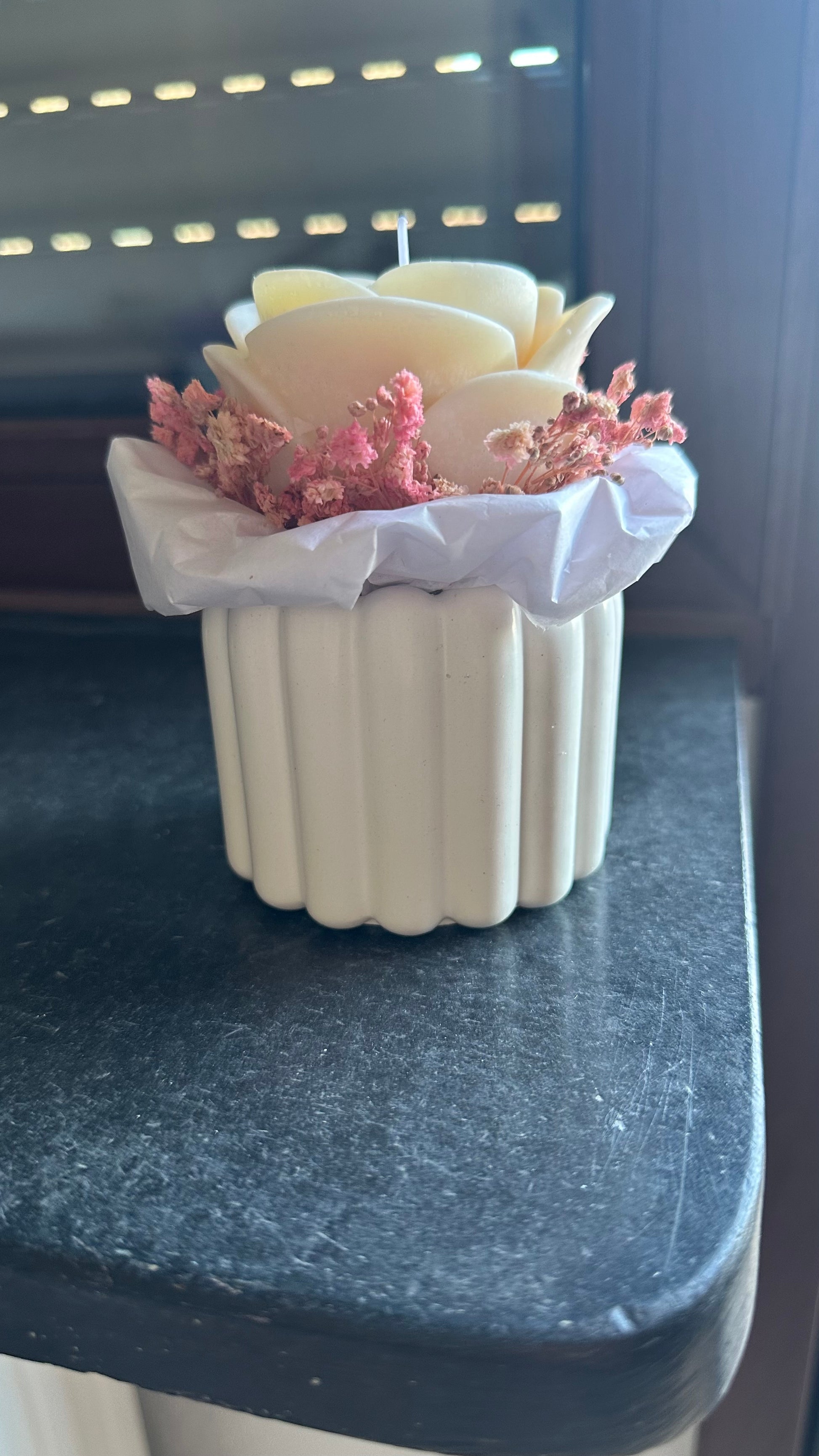 Blumenkerzen in einem Topf mit Trockenblumen verziert.